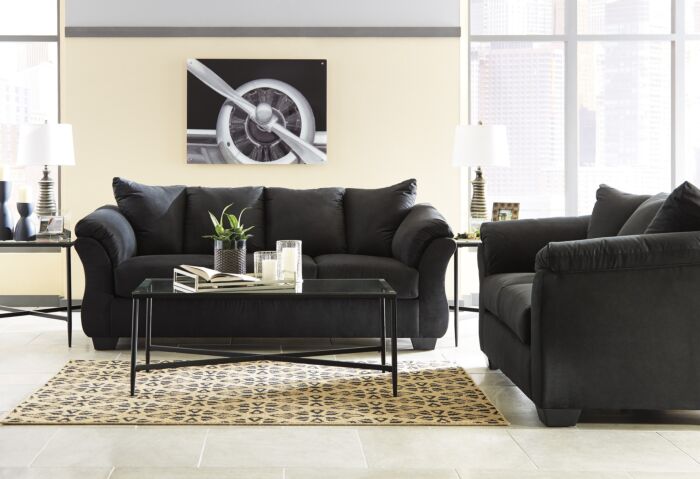 That’s the beauty of the Darcy set—made to suit your appreciation for clean, contemporary style. A striking flared frame, comfy pillow top armrests and an ultra-soft upholstery that holds up to everyday living complete this fashion statement.Brand